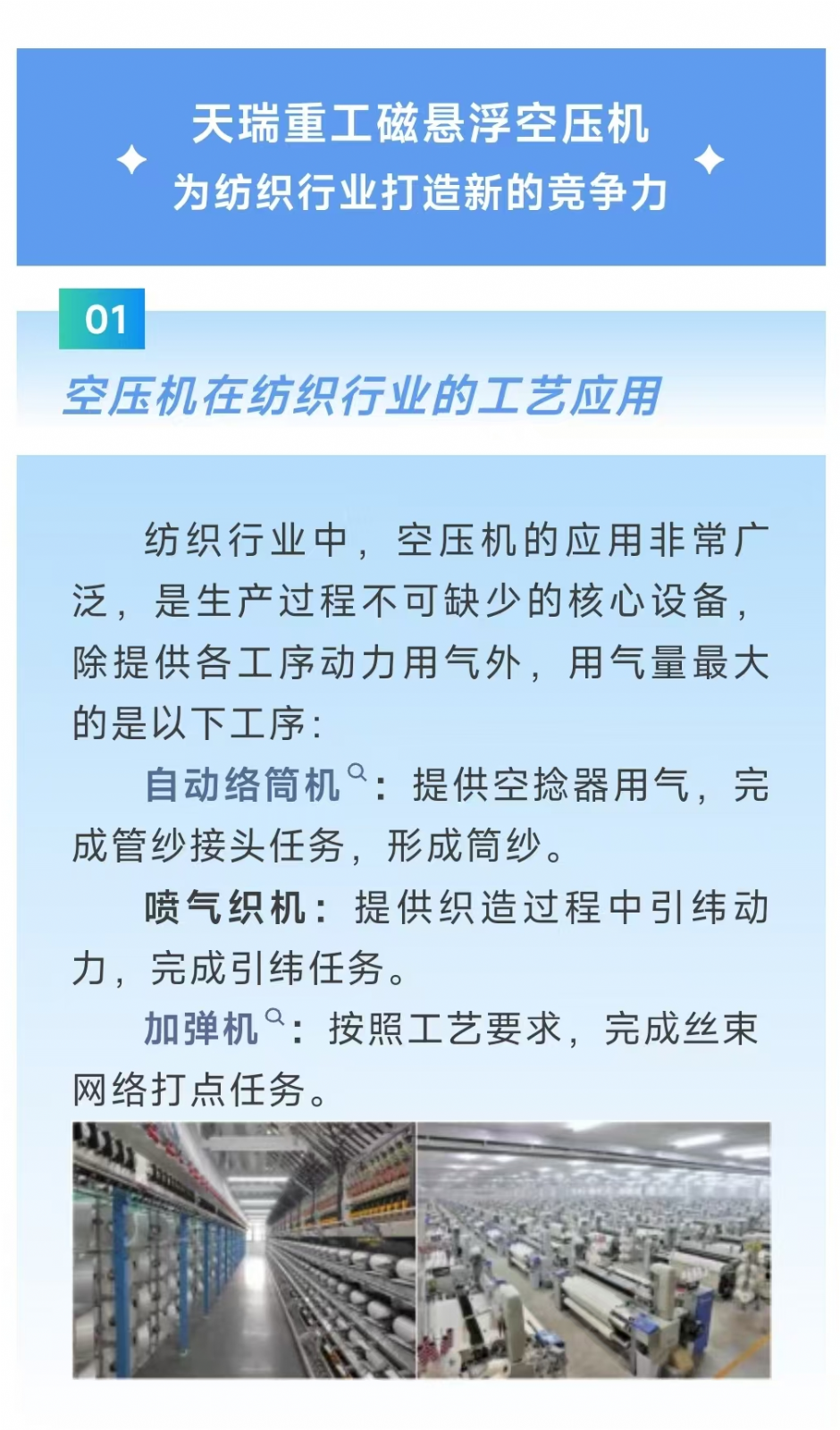 發(fā)布時間:2025-8-1 點擊次數(shù):730紡織行業(yè)中,空壓機的應用非常廣泛,是生產(chǎn)過程不可缺少的核心設備,除提供各工序動力用氣外,用氣量大的是以下工序: