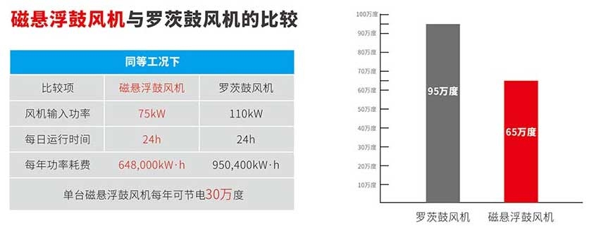 ◇ 以100kW磁懸浮鼓風(fēng)機(jī)為例。與羅茨風(fēng)機(jī)相比,每臺(tái)磁懸浮風(fēng)機(jī)可節(jié)省30萬千瓦時(shí)以上的電能和20萬元以上的電費(fèi)。